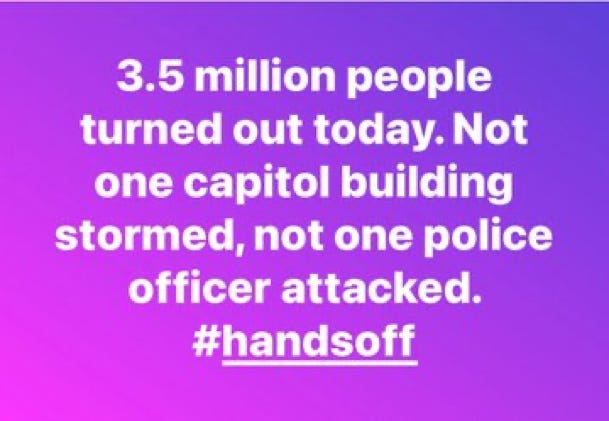 The #handsoff movement was relatively quiet in promoting its intentions but word certainly spread to hundreds of communities in blue and red states across the nation turning out a minimum of 600,000 to a maximum of 3.5 million people in a variety of good and bad weather.
